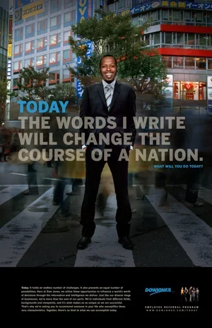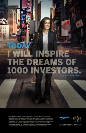 “Today. It holds an endless number of challenges. It also presents an equal number of possibilities. Here at Dow Jones, we utilize these opportunities to influence a world’s worth of decisions through the information and intelligence we deliver. Just like our diverse range of businesses, we’re more than the sum of our parts. We’re individuals from different fields, backgrounds and viewpoints, and it’s what makes us as unique as we are successful. That’s why we’re asking you to recommend someone in your life who exemplifies these very characteristics. Together, there’s no limit to what we can accomplish today.”