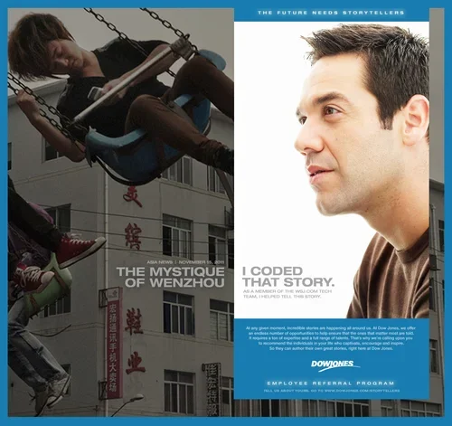 “At any given moment, incredible stories are happening all around us. At Dow Jones, we offer an endless number of opportunities to help ensure that the ones that matter most are told. It requires a ton of expertise and a full range of talents. That’s why we’re calling upon you to recommend the individuals in your life who captivate, encourage and inspire. So they can author their own great stories, right here at Dow Jones.”